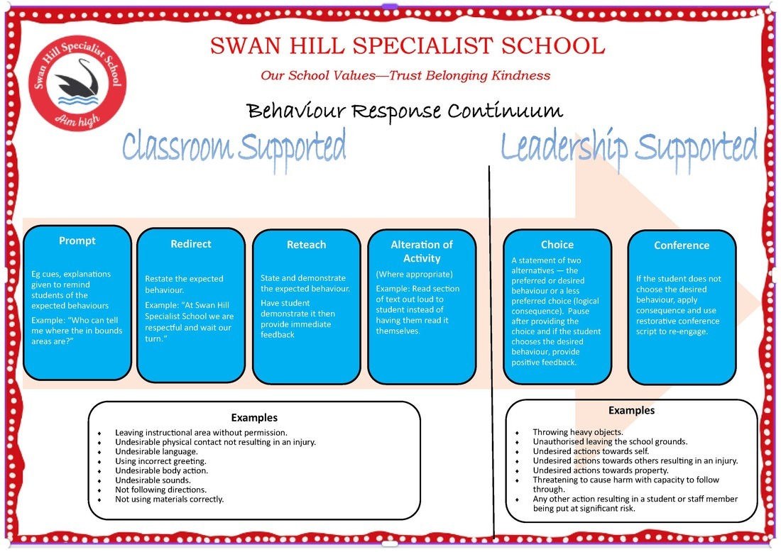 Swan Hill Specialist School has adopted a School Wide Positive Behaviour Support (SWPBS) framework. This is a proactive approach, revolving around actively teaching all students agreed expected behaviours and pro-social skills. Actively teaching these skills assists our students to develop positive behaviours and maximises each individuals social, emotional, behavioural and academic outcomes. Acknowledging students who meet the explicitly taught behaviours and pro-social skills, provides positive reinforcement and encourages appropriate behaviour. In addition, a small number of students may require individualised programs and intensive interventions to assist them to develop expected behaviours.